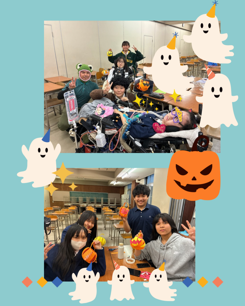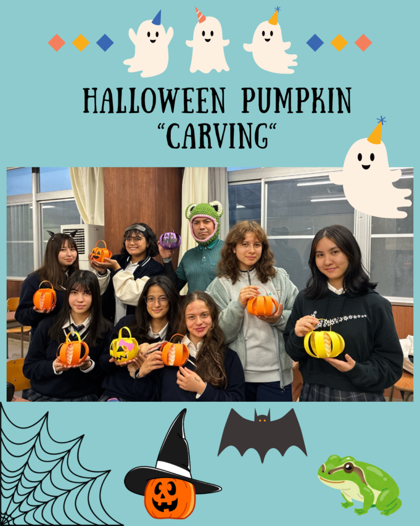 2025年10月31日(金)English Speaking Society部で、ハロウィンパーティーを開催しました。ALTの先生からアメリカのハロウィン文化を学んで、ジャック・オ・ランタンの工作をしました。海外のカラフルなカボチャにちなんでイエロー&オレンジのランタンにデコレーションをしたり、かわいい衣装を用意したりして楽しみました。