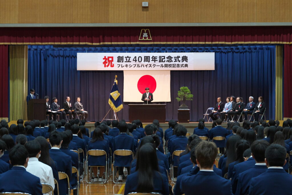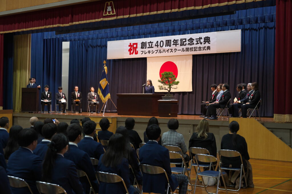 令和7年11月27日(木)に愛知県立御津あおば高等学校創立40周年記念式典、並びにフレキシブルハイスクール開校記念式典を盛大に挙行いたしました。式典の司会進行は生徒会執行部の生徒が務め、落ち着いた態度と的確な進行で、式典を立派にまとめ上げました。