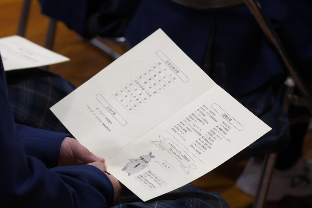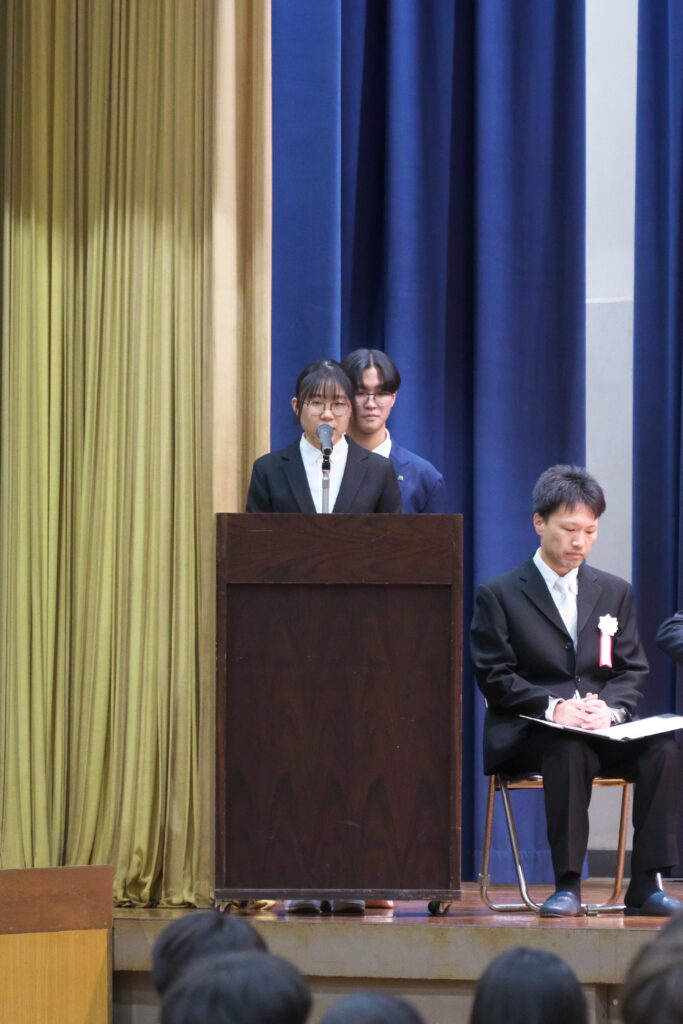 式典の中では、代表生徒が本校の伝統を受け継ぎ、未来へとつなげていく決意を込めた「誓いの言葉」を力強く述べ、参加者に深い感動を与えました。